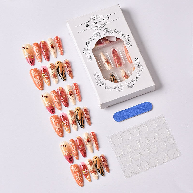 Handcrafted 3D Floral & Maple Press-On Nails –Long Almond | 30PCS Set